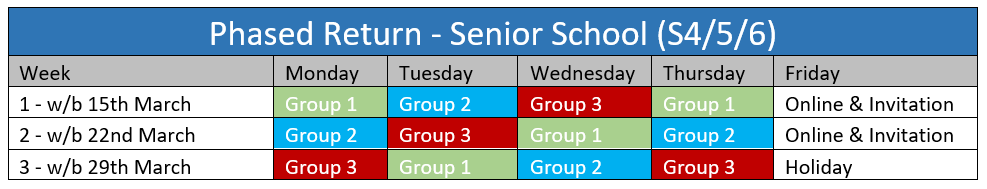 Following the Scottish Government’s announcement for the phased return of secondary pupils to schools, we share the following guidance for the arrangements beginning on Monday 15th March and ending on Thursday 1st April.